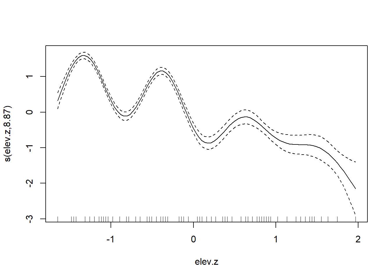 Finally, we will use gamm4::gamm4 to fit a new model to the tick data from Elston et al. (2001), this time using a smoothing spline to estimate the effect of elevation on tick abundance. Like mgcv::gamm, gamm4::gamm4 returns models with two compoments: one called mer that contains output from the portion of the model that invokes lme4::(g)lmer, and one called gam that contains the smoothing terms.