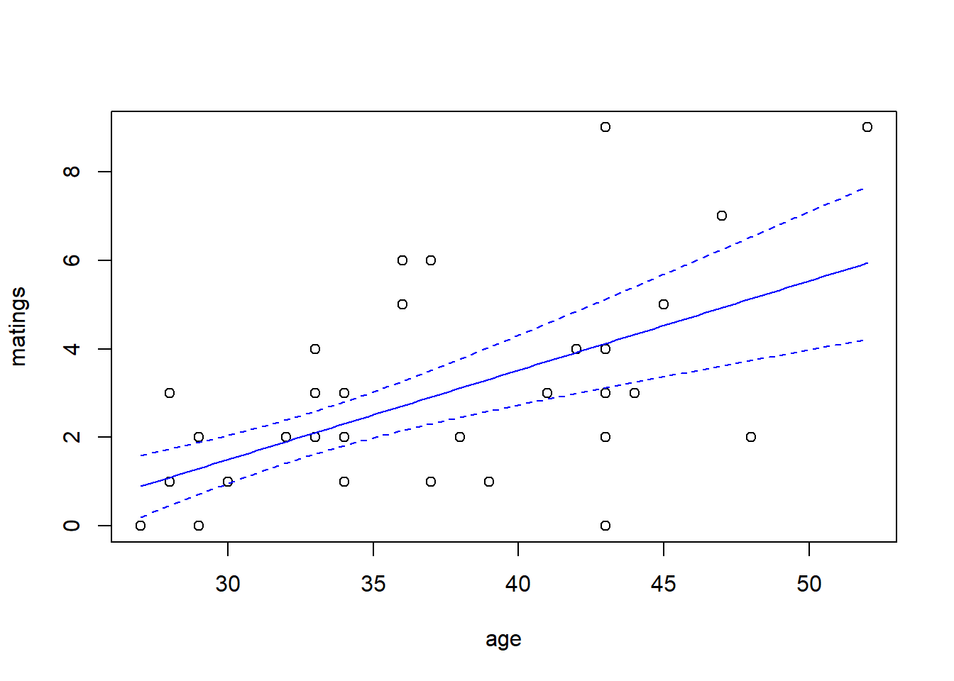 ## glm(formula = matings ~ age, family = poisson(link = "log"),