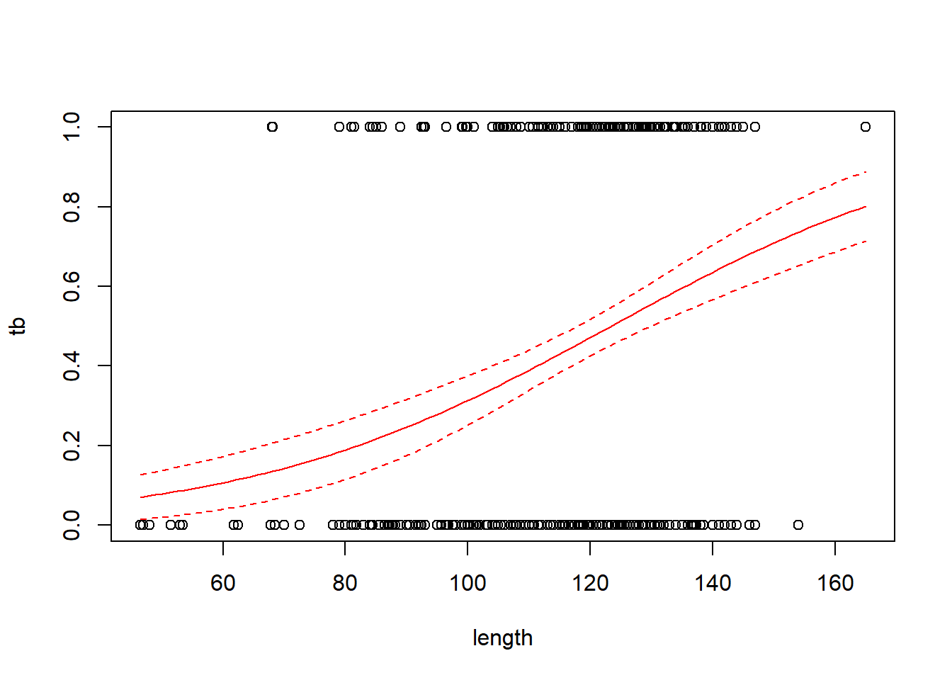lines(x.vals, inv.logit(fm1.fit$fit - 1.96 * fm1.fit$se.fit), lty = "dashed")