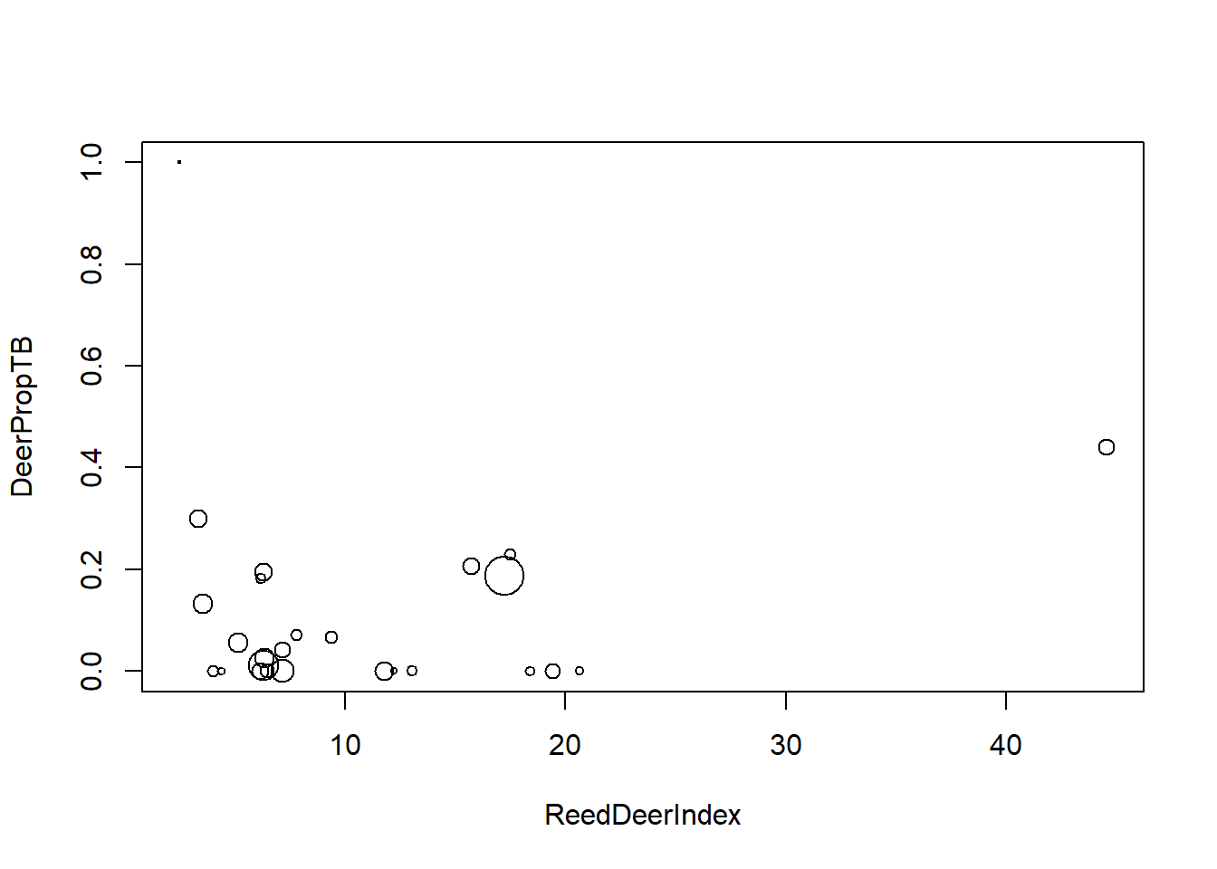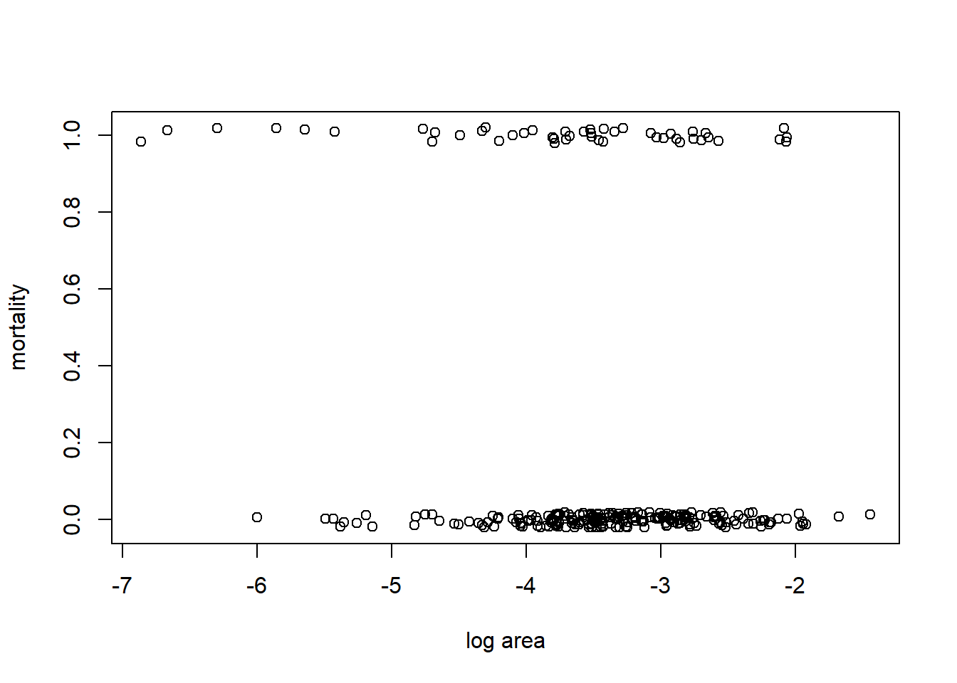 with(coral, plot(jitter(mortality, amount = 0.02) ~ ln_area, xlab = "log area", ylab = "mortality"))