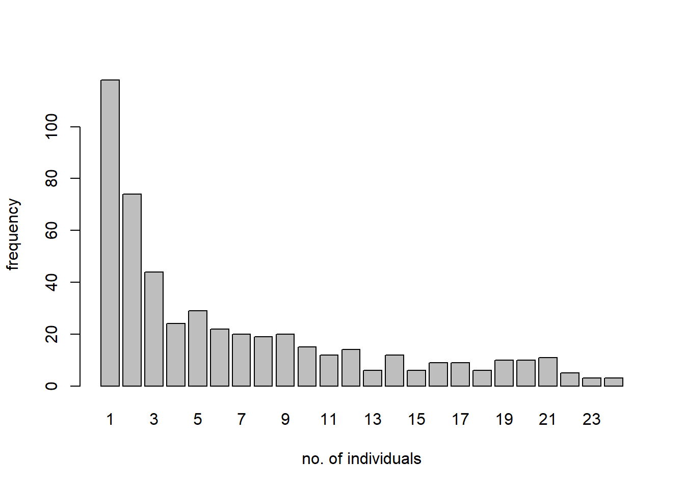 However, the help documentation also says “Actually, 119 species had over 24 observed frequencies, so this could/should be appended to the data set.” So these data are only a subset of the data that Corbet actually found.↩︎