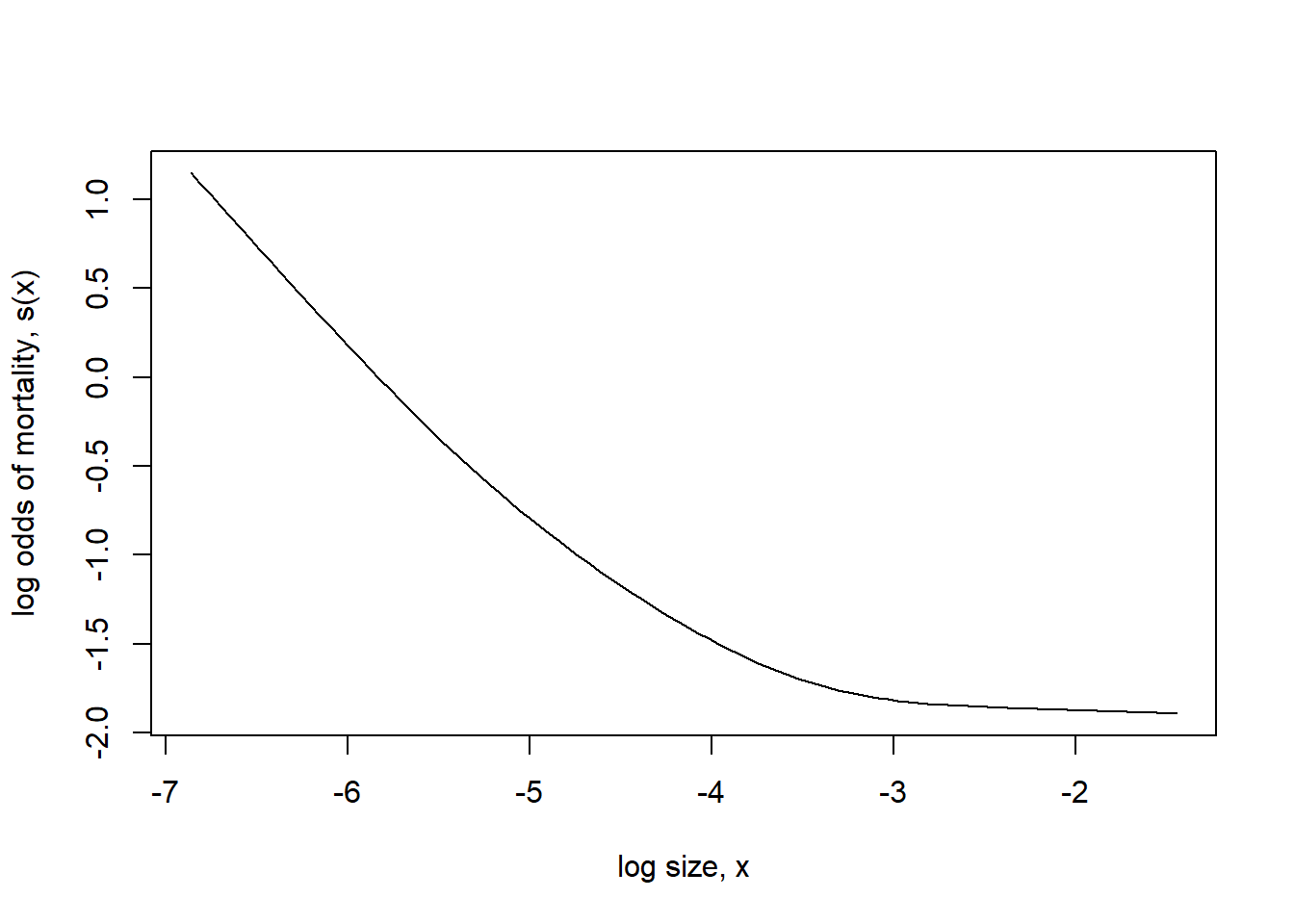 We fit a GAM with a binomial response, logit link, and use a smoothing spline to capture the relationship between log size and (the log odds of) mortality. Recall that a smoothing spline determines the degree of smoothness by generalized cross-validation.