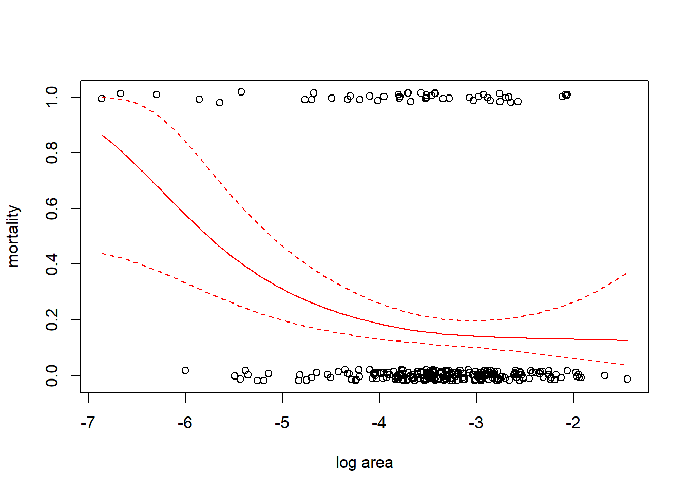 fm2 <- gam(mortality ~ s(ln_area), family = binomial(link = "cloglog"), data = coral)