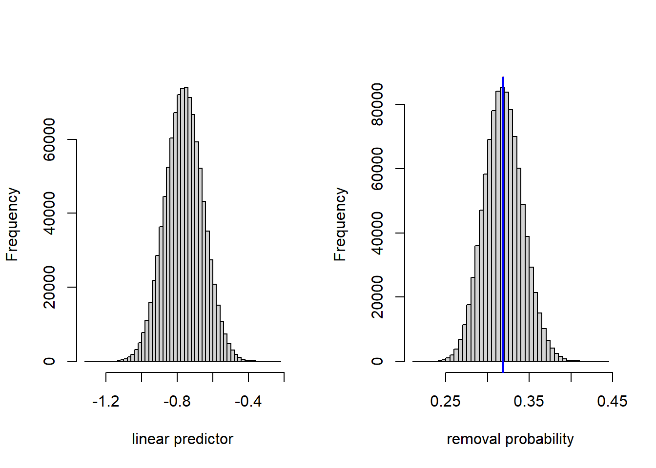 To get a sense of how the conditional means compare to the marginal means, we will compute the conditional mean removal rate of dark morphs at a distance 20 km from the city center.
