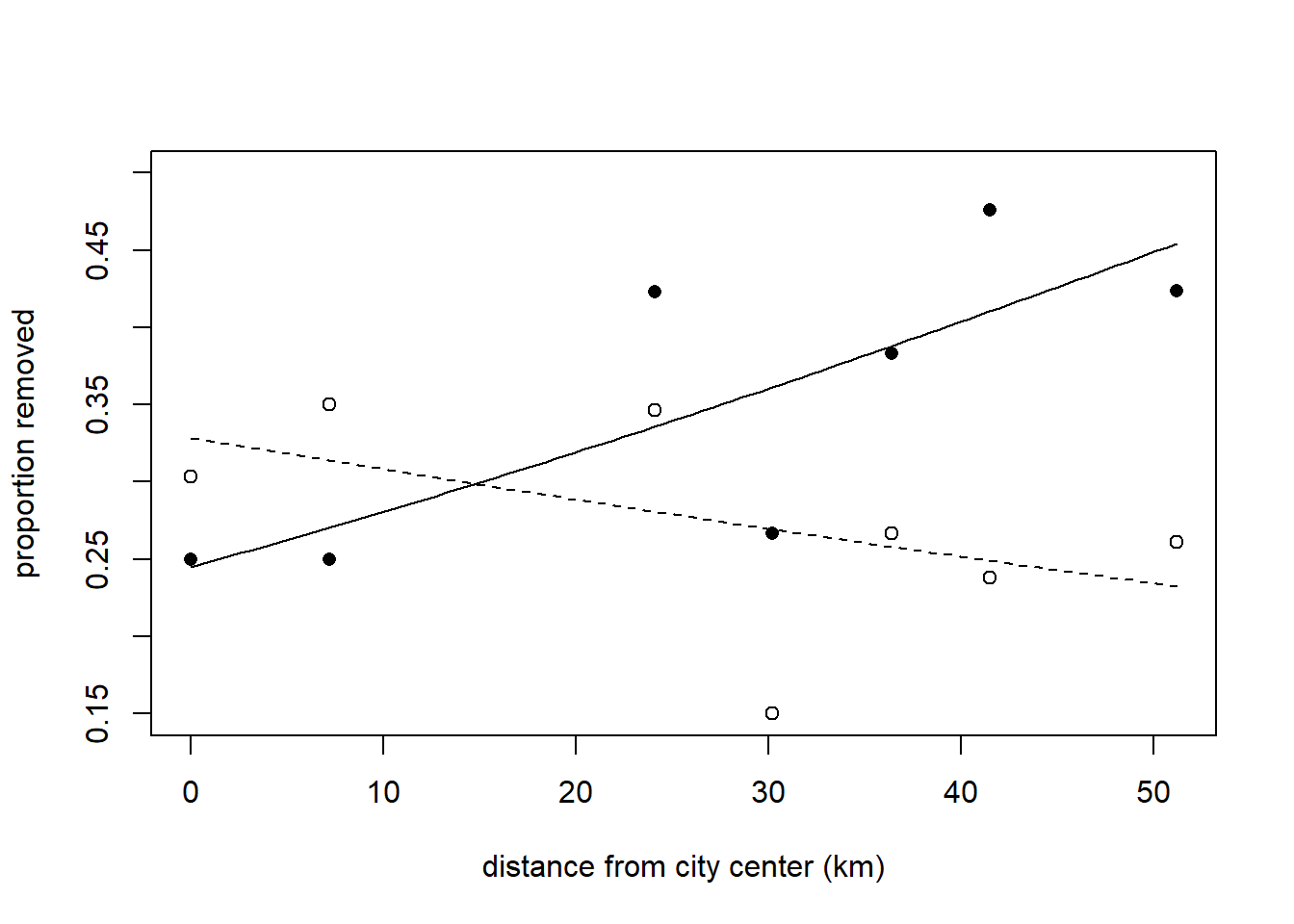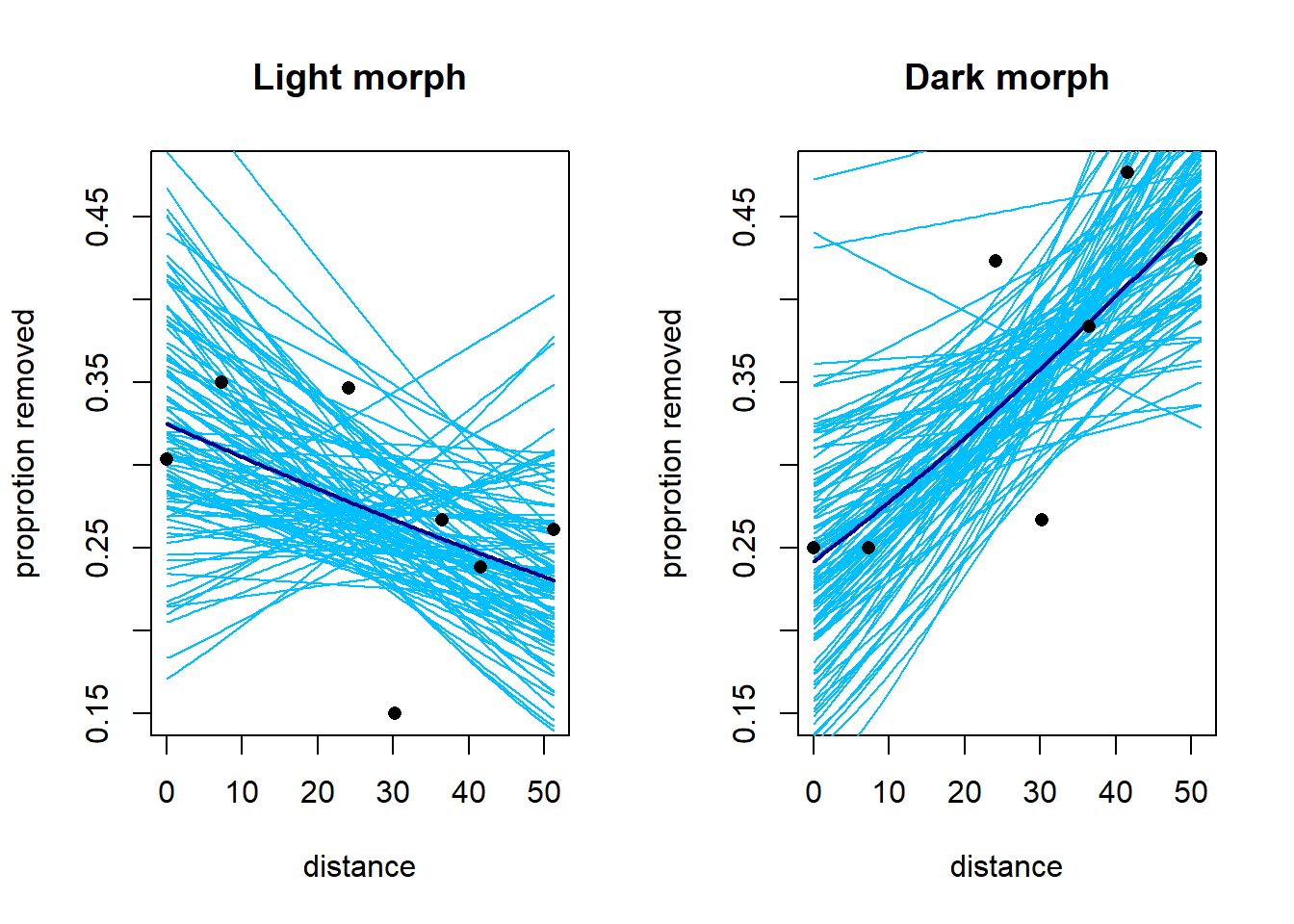 The estimate of the difference between slopes on the log-odds scale is 0.0278, with an approximate 95% confidence interval of (0.0164, 0.0391). This corresponds to an odds ratio of 1.028, with an approximate 95% confidence interval of (1.017, 1.040). To visualize the model, we might plot the fitted proportion removed vs. distance for both color morphs. Bear in mind that fitted values here correspond to marginal mean removal rates.