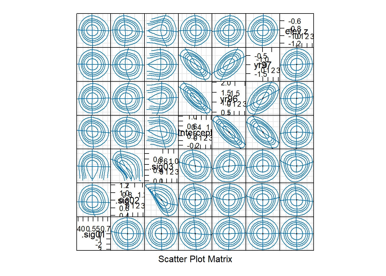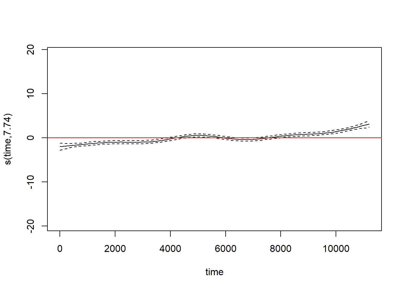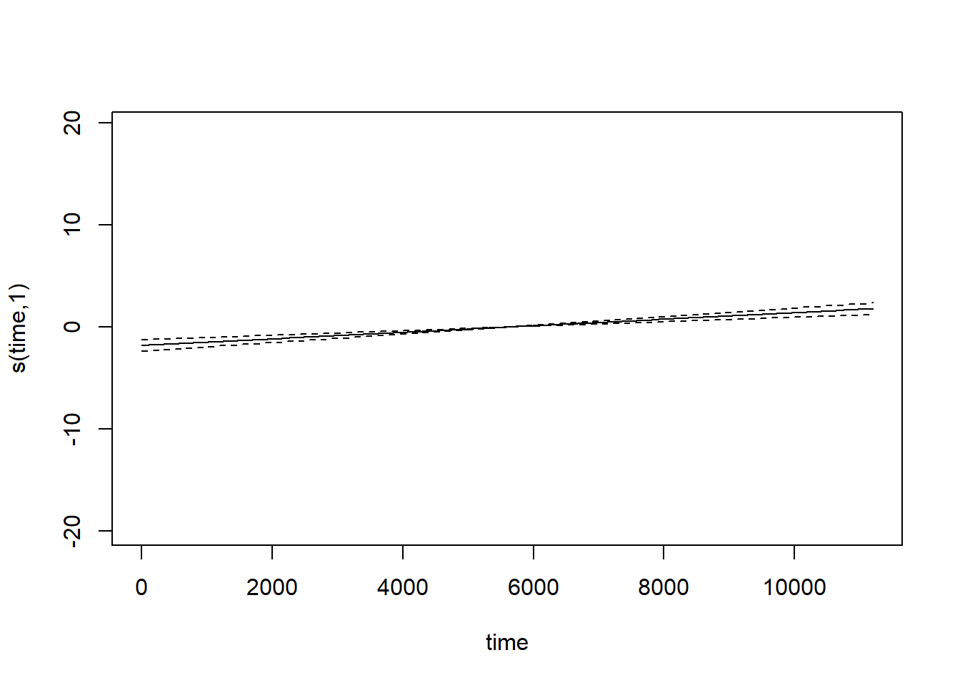 The best-fitting smoothing spline for the among-year trend is linear. Let’s replace the smoothing spline by a linear term so that it is easier to extract the slope, which will now be contained in the lme portion.