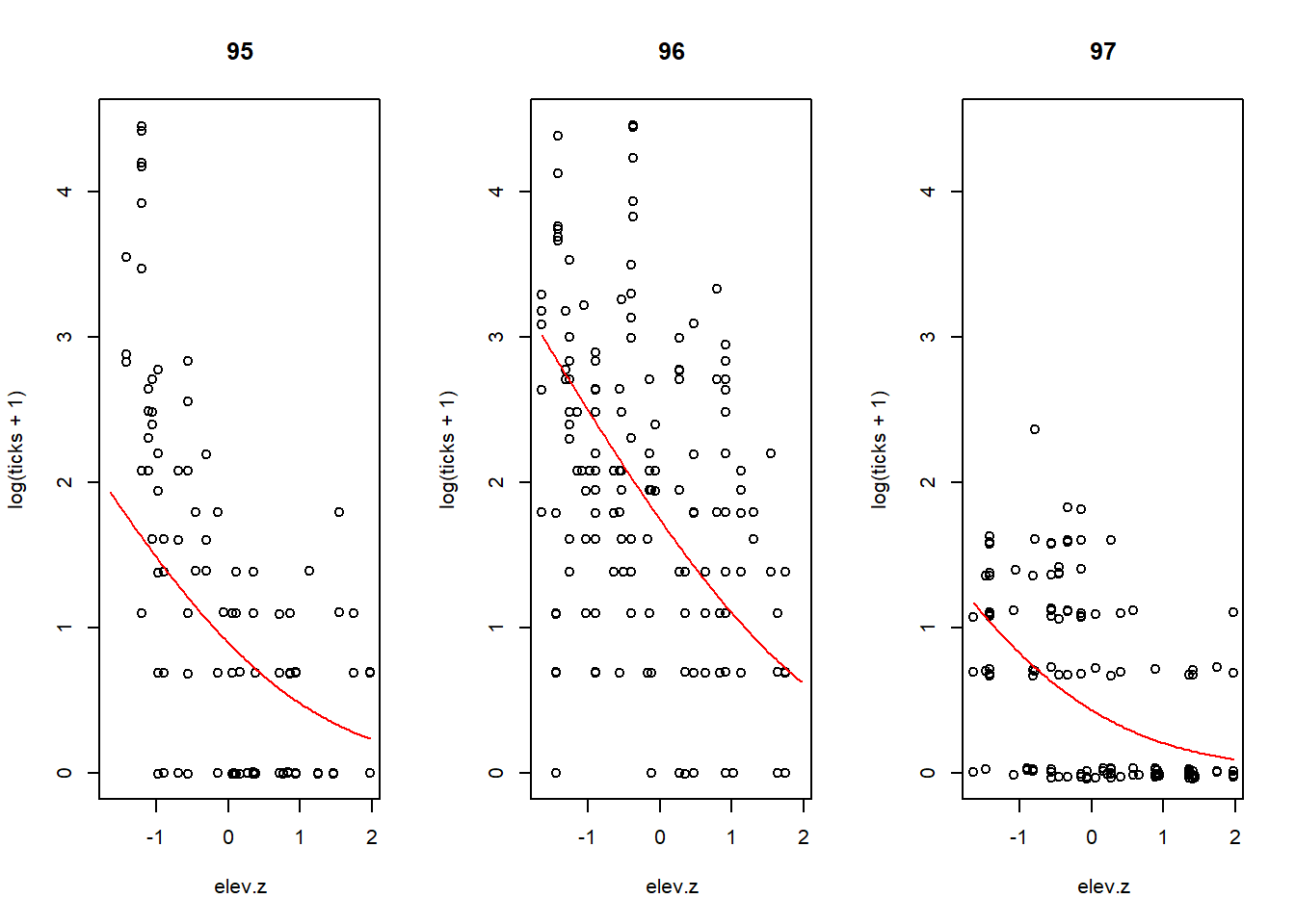 Our best fitting model continues to contain a linear association between elevation and tick abundance. Again, it is interesting to compare this fit to one without the random effects for brood or location, and to see how the absence of these random effects produces a substantially different (and presumably much over-fit) relationship between elevation and tick abundance.