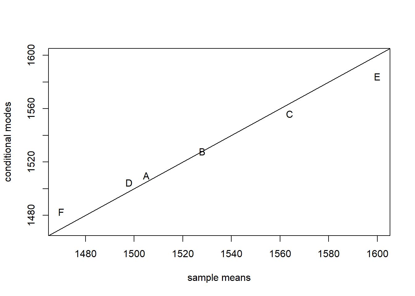Now plot the sample means against the conditional modes: