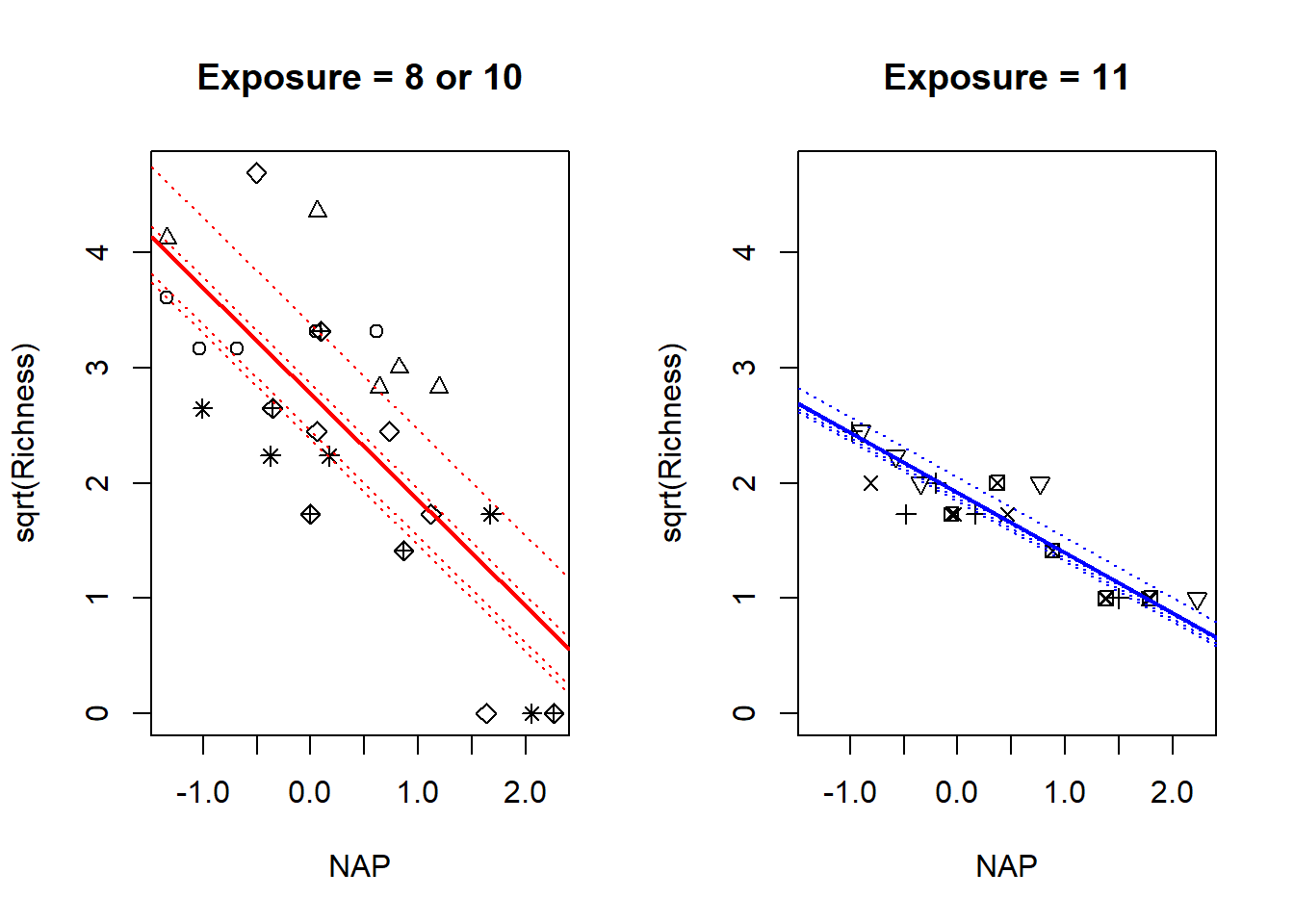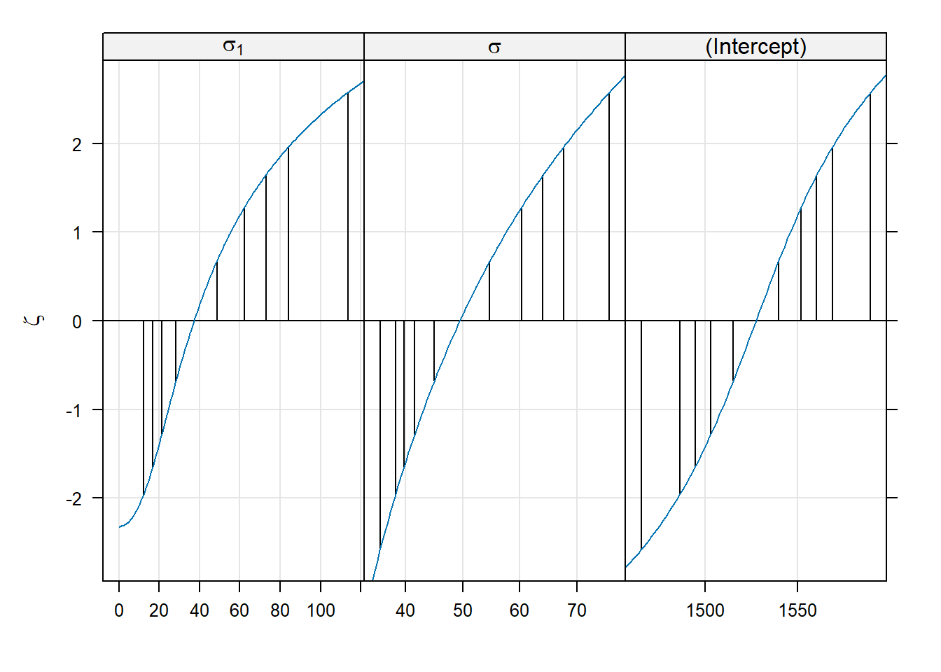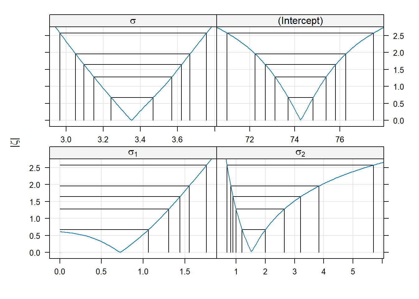 Within each panel, the values plotted on the vertical axis are the signed square roots of the likelihood ratio test statistic. This value is denoted by the Greek letter \(\zeta\) (“zeta”); hence, the plots we are viewing are called zeta-plots.