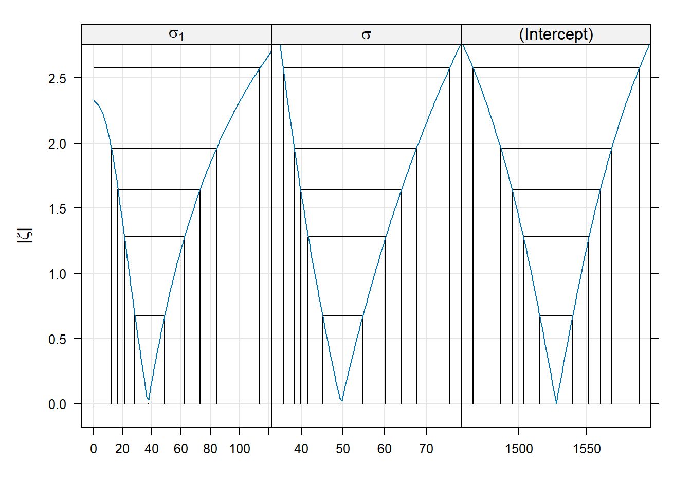Switching to ML has decreased our estimate of the batch-level variance, and decreased it by quite a bit. To construct profile-based intervals, we use the lme4::profile function.6 We will use the xyplot function from the lattice package to display the profiles.