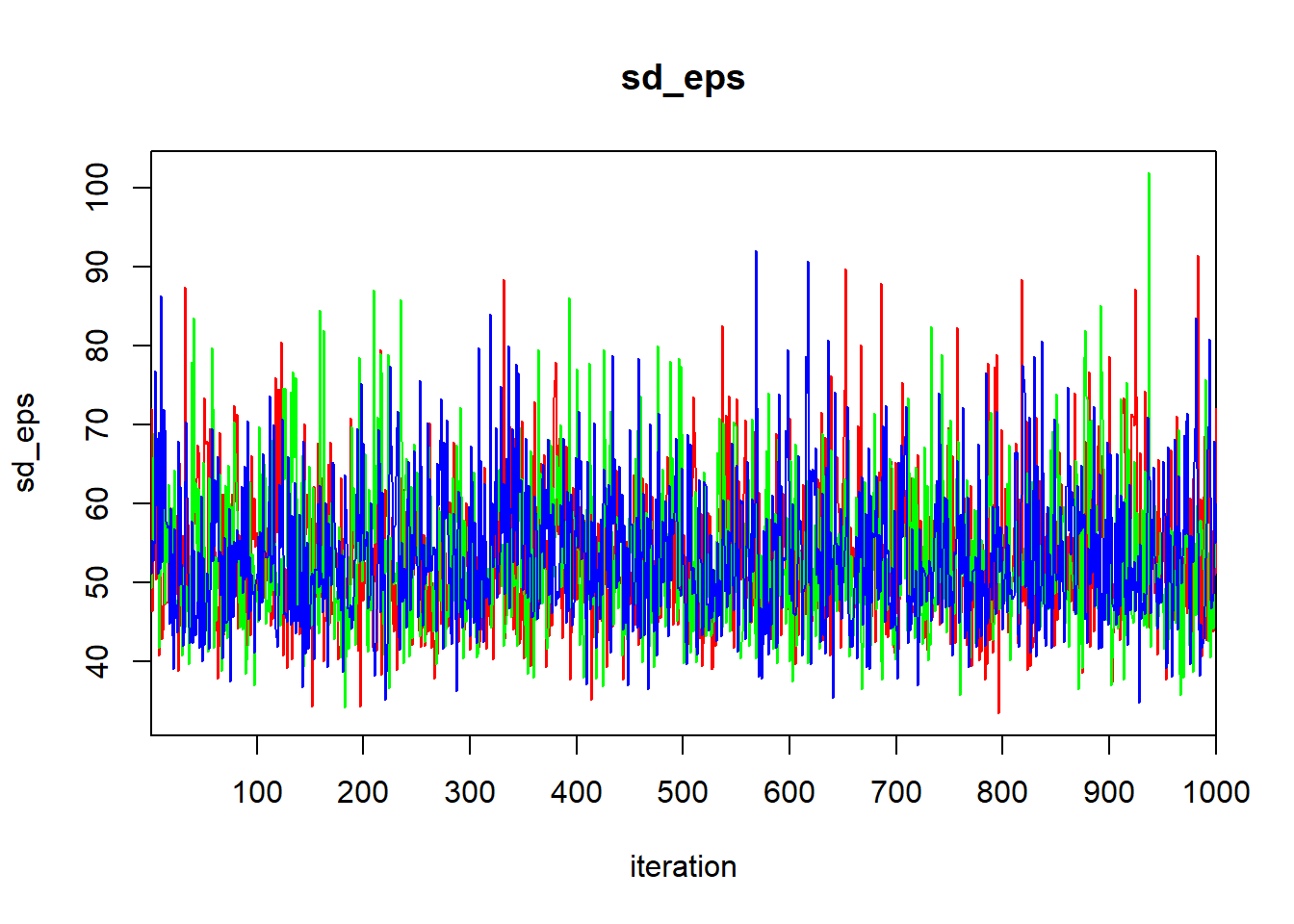 There are three panels here, one for each of the parameters in the model. These parameters are labeled as \(\sigma_1\) for the standard deviation of the block-level random effect (what we have written \(\sigma_B\)), \(\sigma\) for the standard deviation of the errors (what we have written as \(\sigma_\varepsilon\)), and “(Intercept)” for the global mean (what we have written as \(\mu\)).
