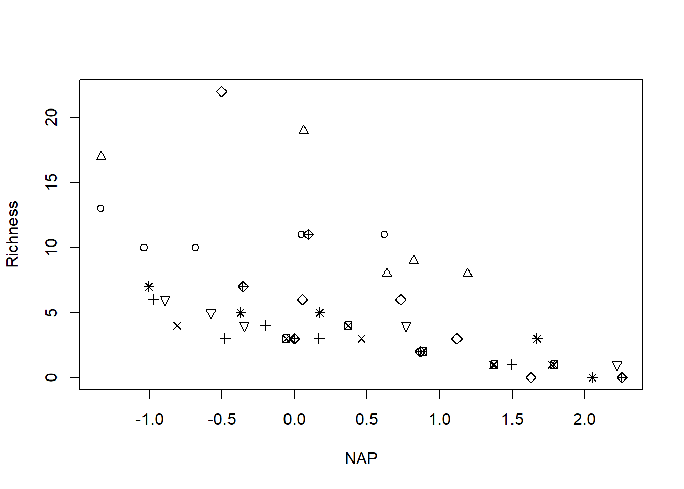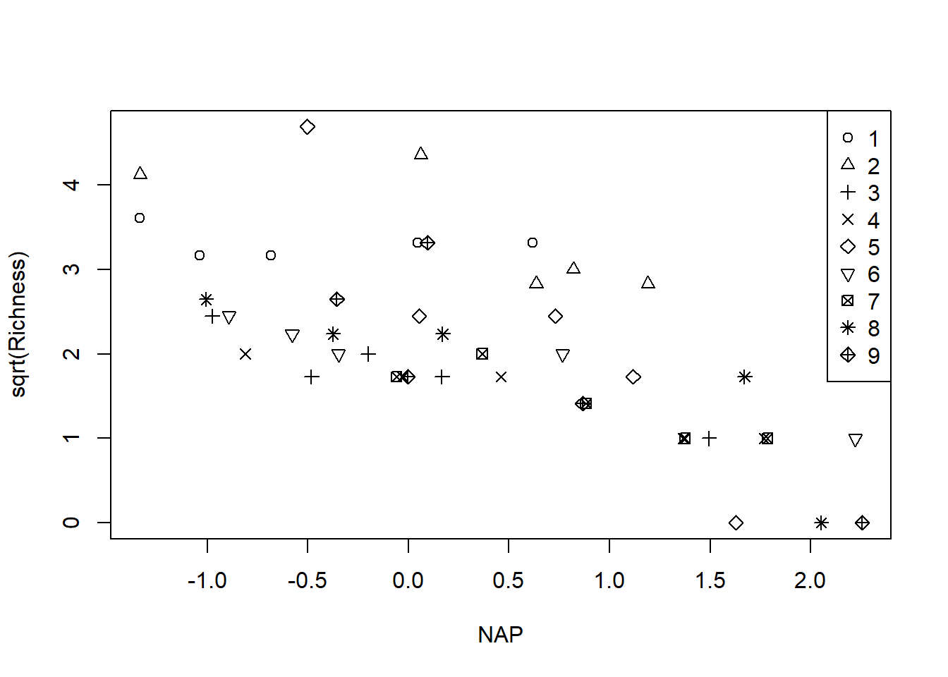 pch  = LETTERS[1:6])