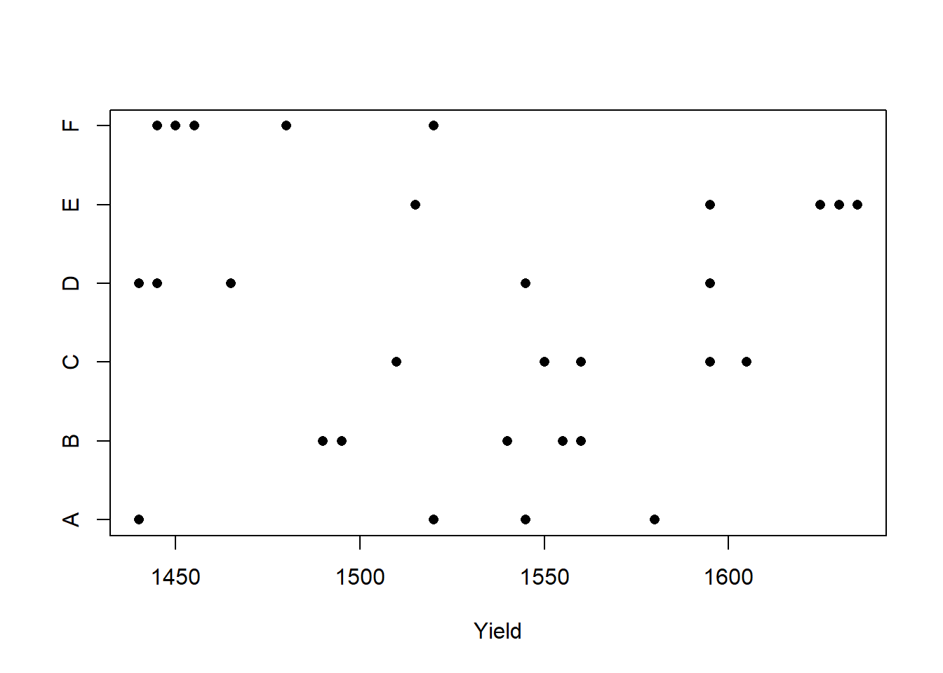 To develop some notation, let \(i = 1, \ldots, 6\) index the batches, let \(j = 1, \ldots, 5\) index the observations within each batch, and let \(y_{ij}\) denote observation \(j\) from batch \(i\).