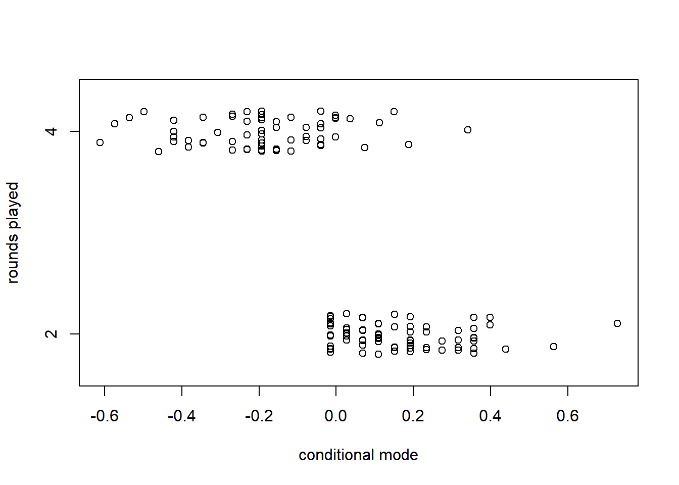 Finally, it is interesting to compare the conditional modes for the players who qualified to play in rounds 3 and 4, vs. the players who were “cut”.