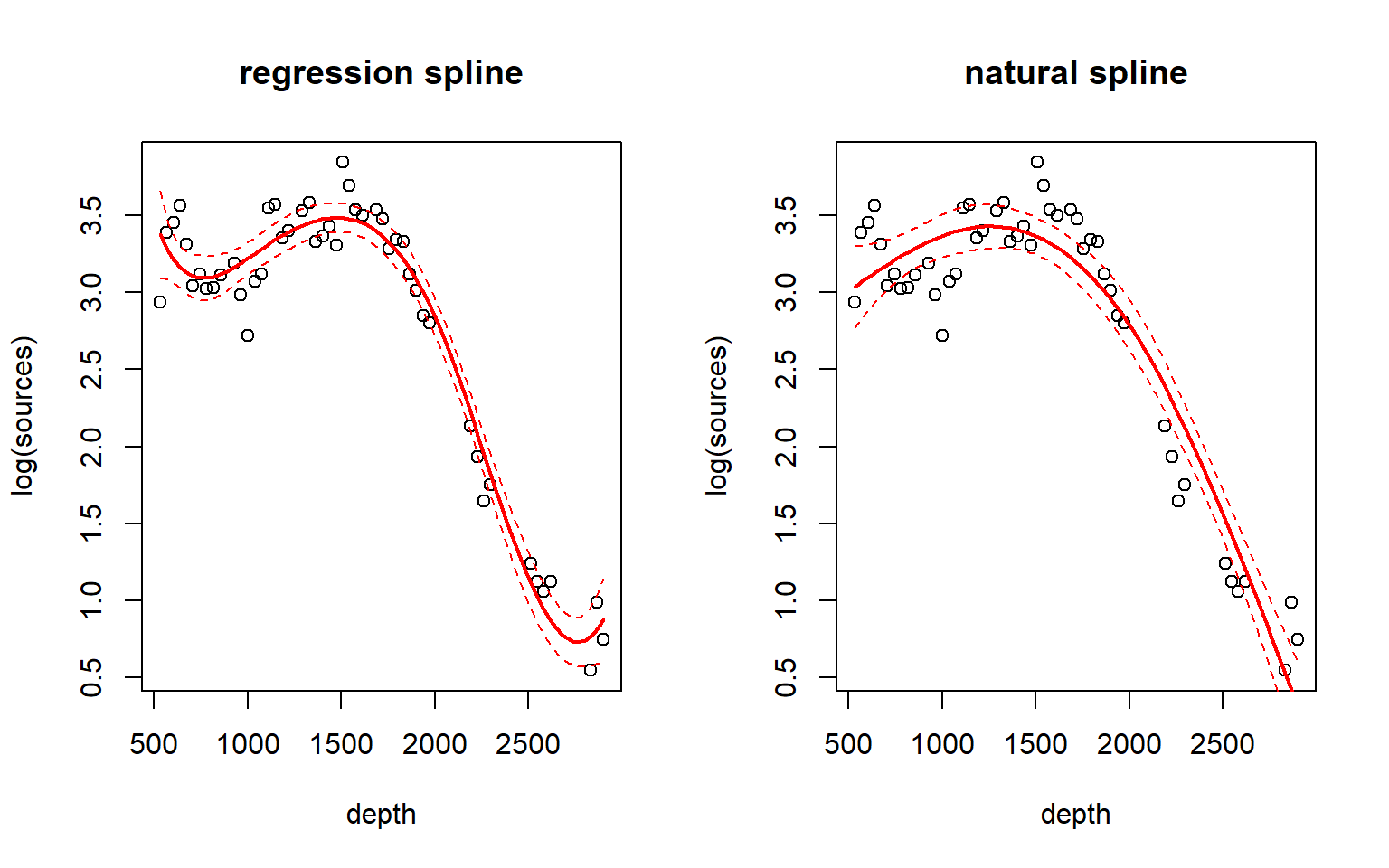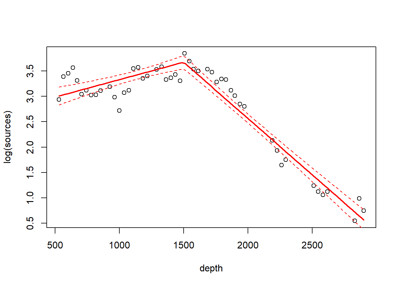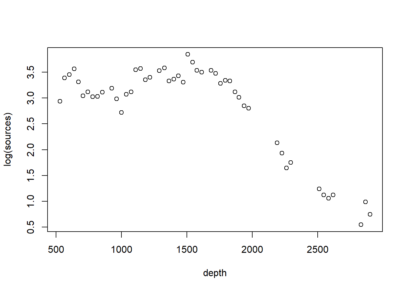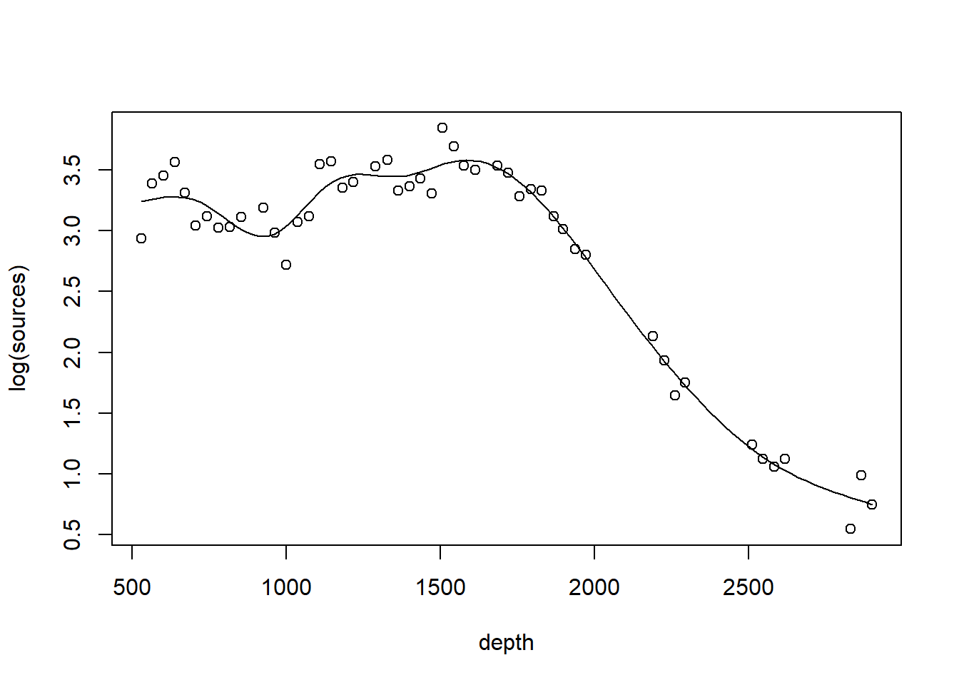 fm1 <- lm(log(sources) ~ bs(depth, knots = c(1000, 2000)), data = st19)