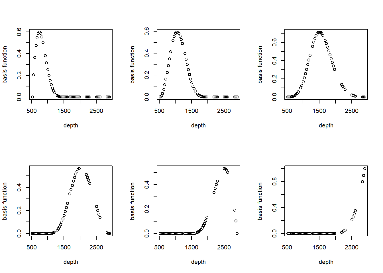 . For expository purposes, we will construct a spline with two knots, arbitrarily placed at 1000 m and 2000 m depth.