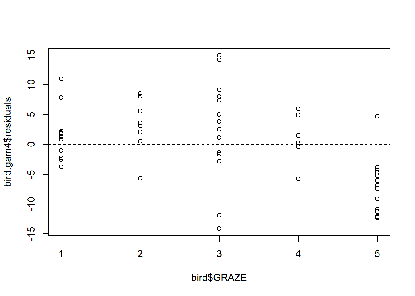 plot(x = bird$GRAZE, y = bird.gam4$residuals)